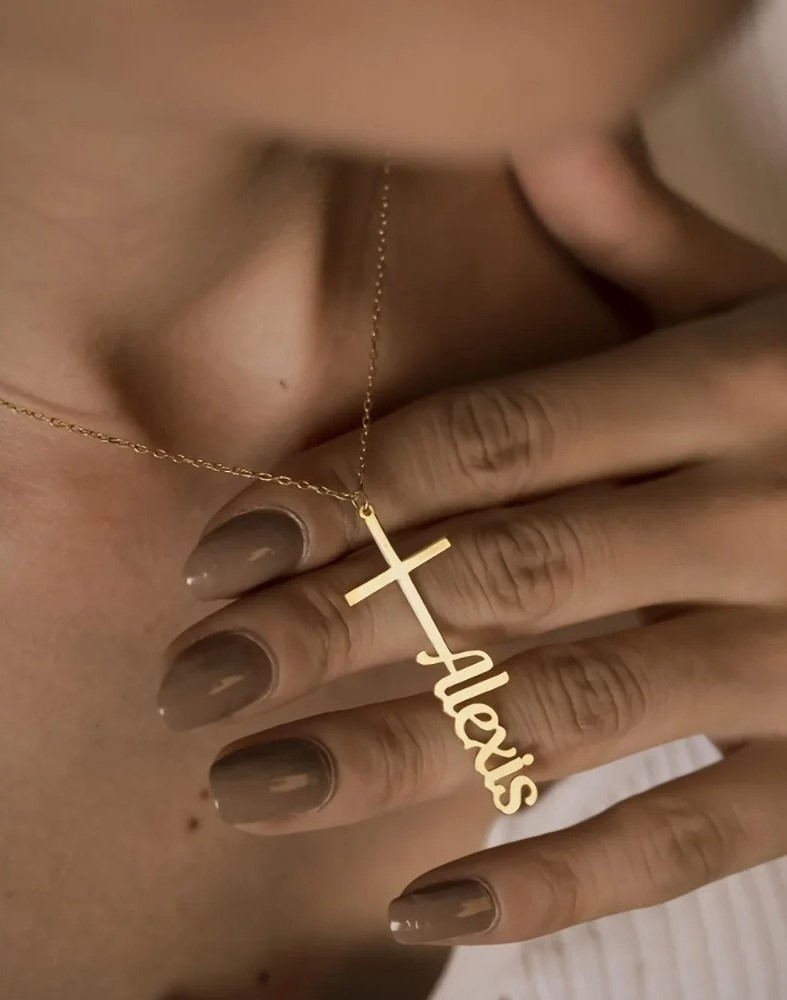 Colier personalizat cu nume și pandantiv cruce, realizat din oțel inoxidabil placat cu aur 18K.