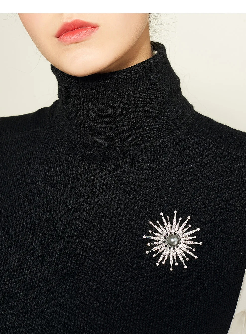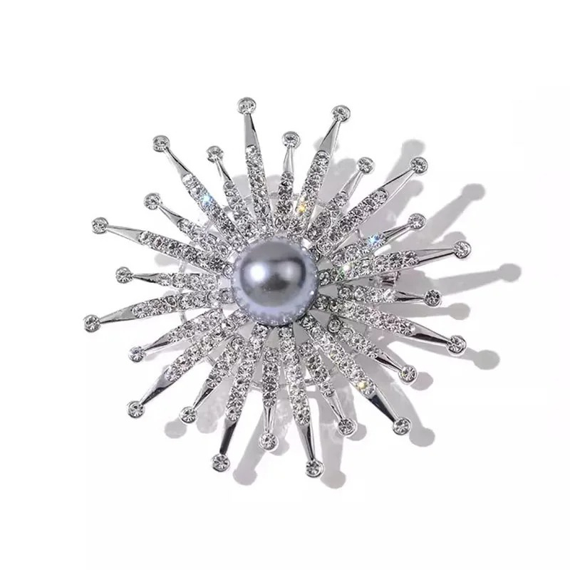 Broșă argintie, decorată cu zirconiu și perlă gri, realizată din aliaj de zinc.