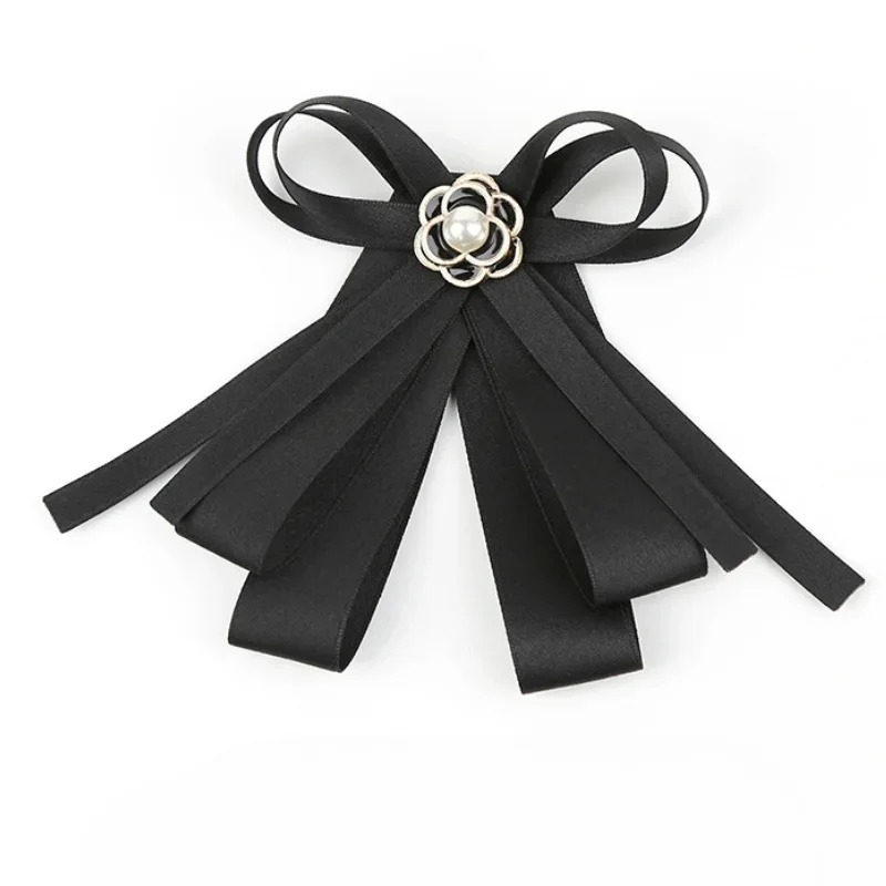 Broșă papion neagră, realizată din material textil și decorată cu perlă.