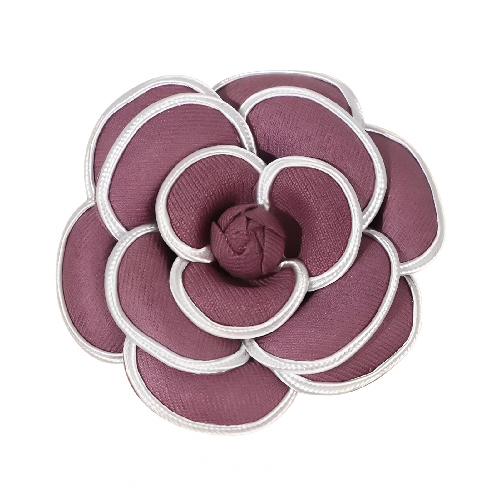 Broșă handmade, roz închis, în formă de floare, realizată din material textil.