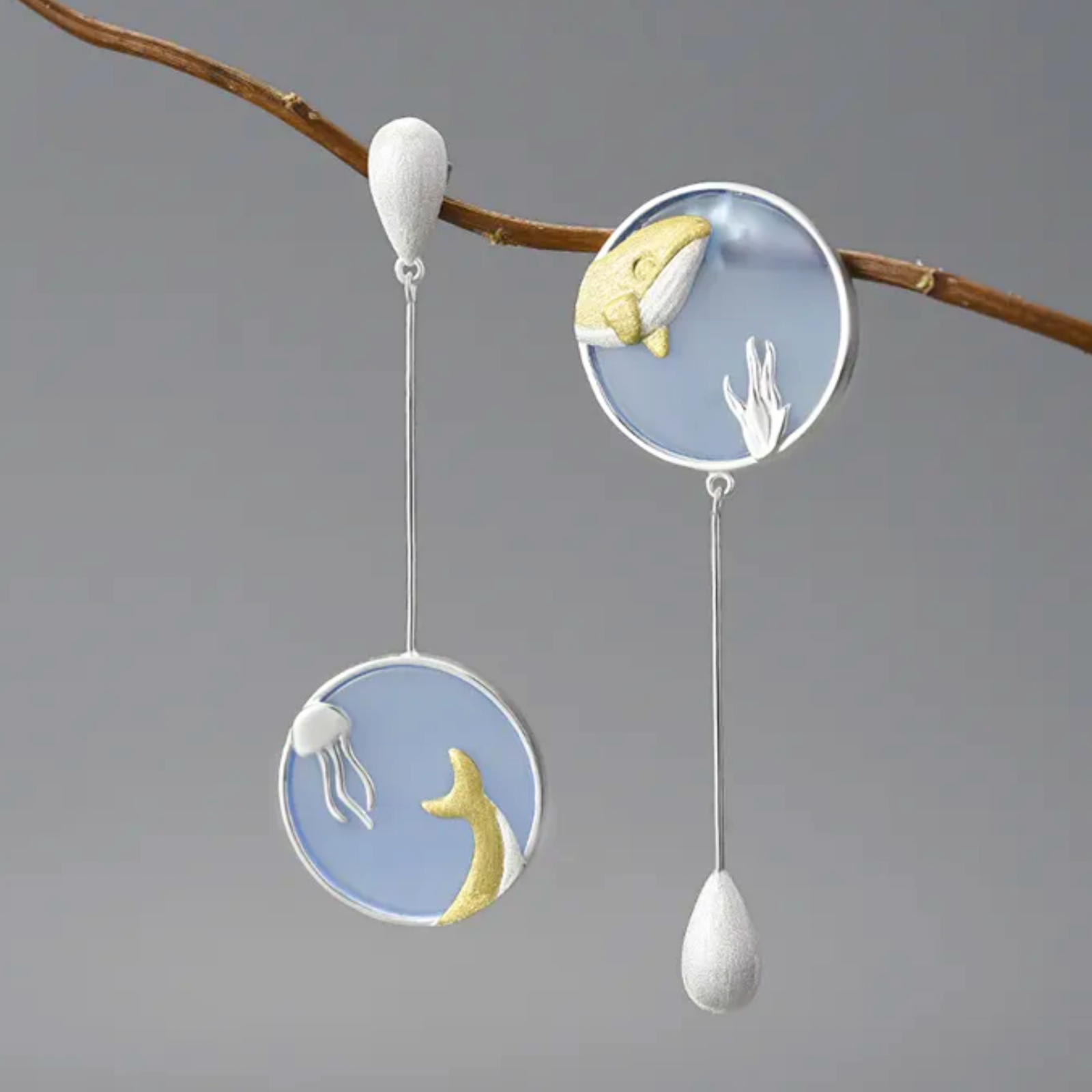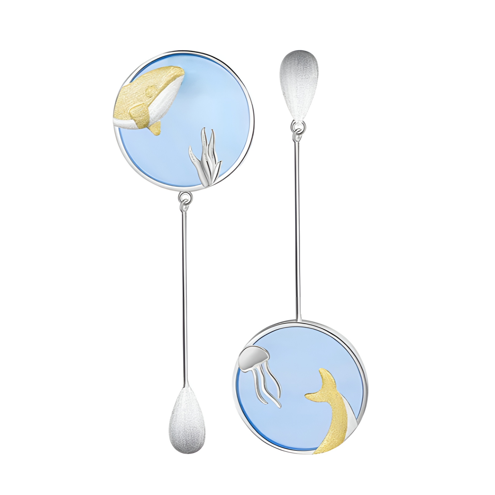 Cercei lungi, realizați manual din argint 925 placat cu aur 18K, model lumea acvatică.