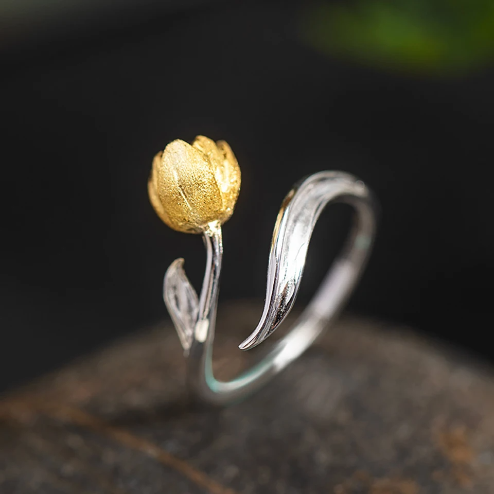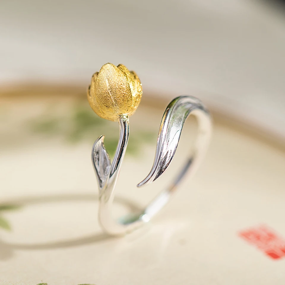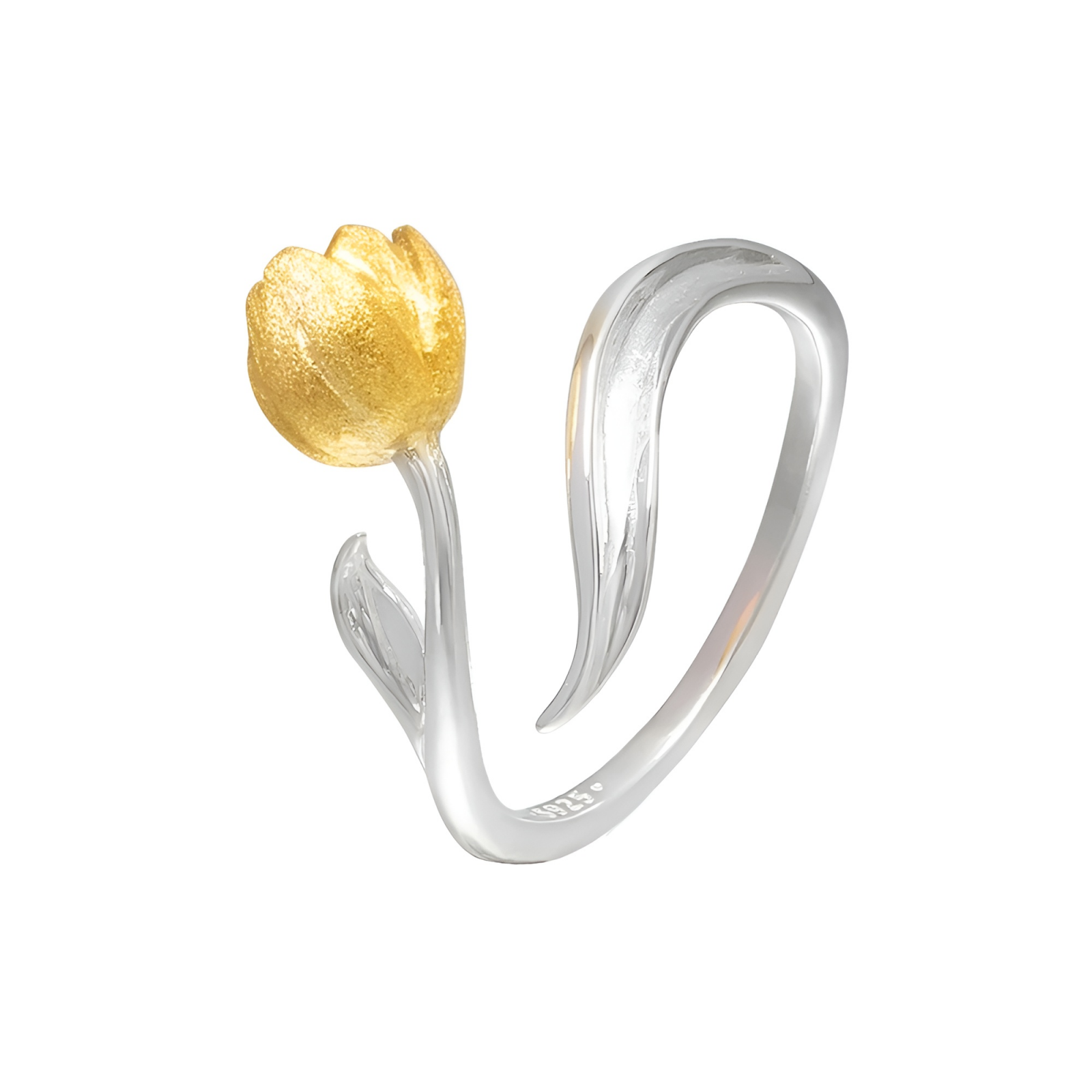Inel reglabil, realizat din argint 925 placat cu aur 18K, în formă de lalea.