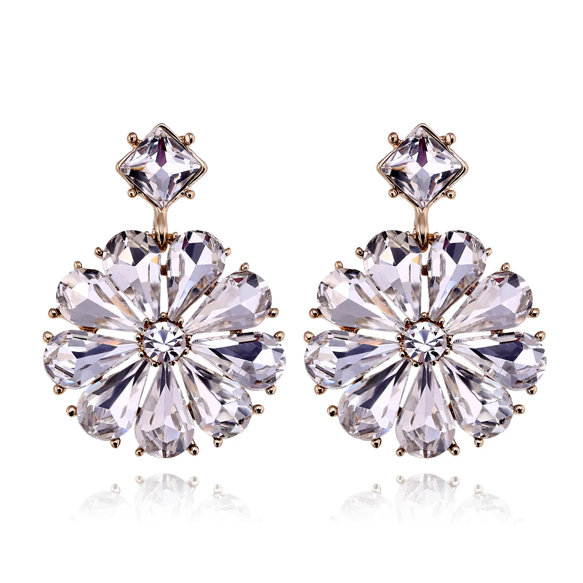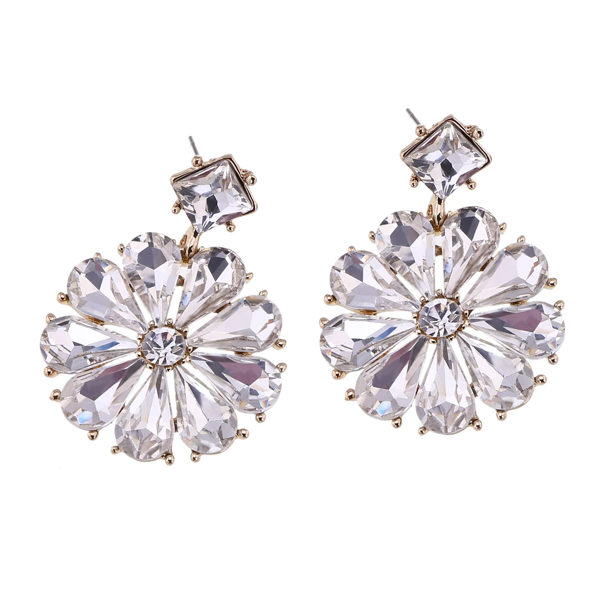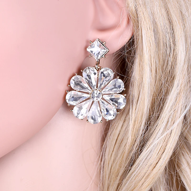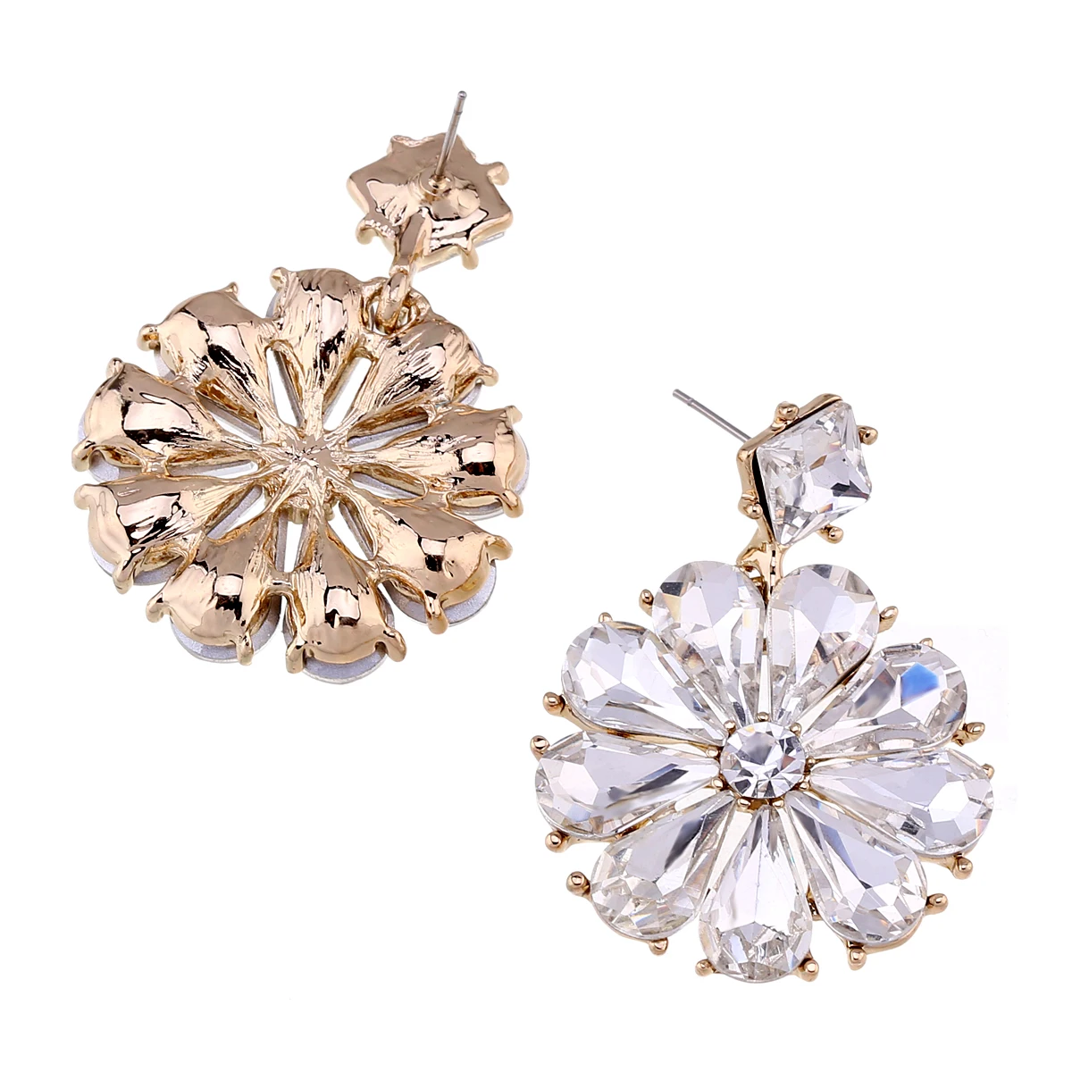 Cercei cu montură aurie, cu formă florală, realizați din aliaj de zinc și decorați cu pietre.