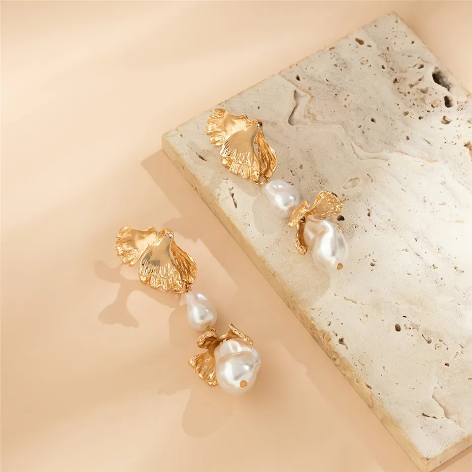 Cercei Patricia, aurii, realizați din aliaj de zinc, cu formă florală și decorați cu perle artificiale asimetrice.