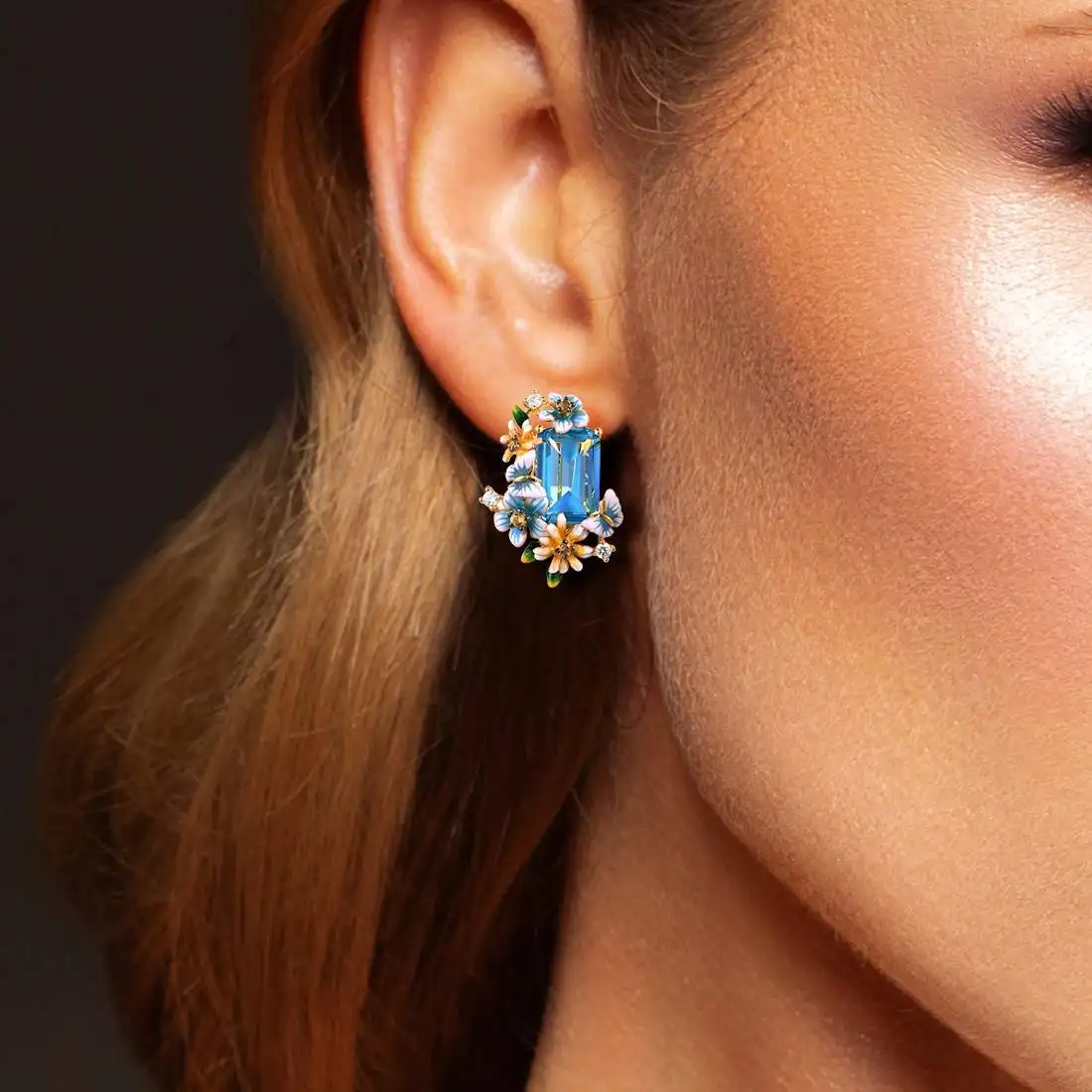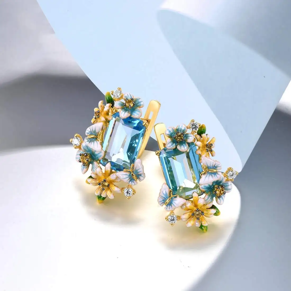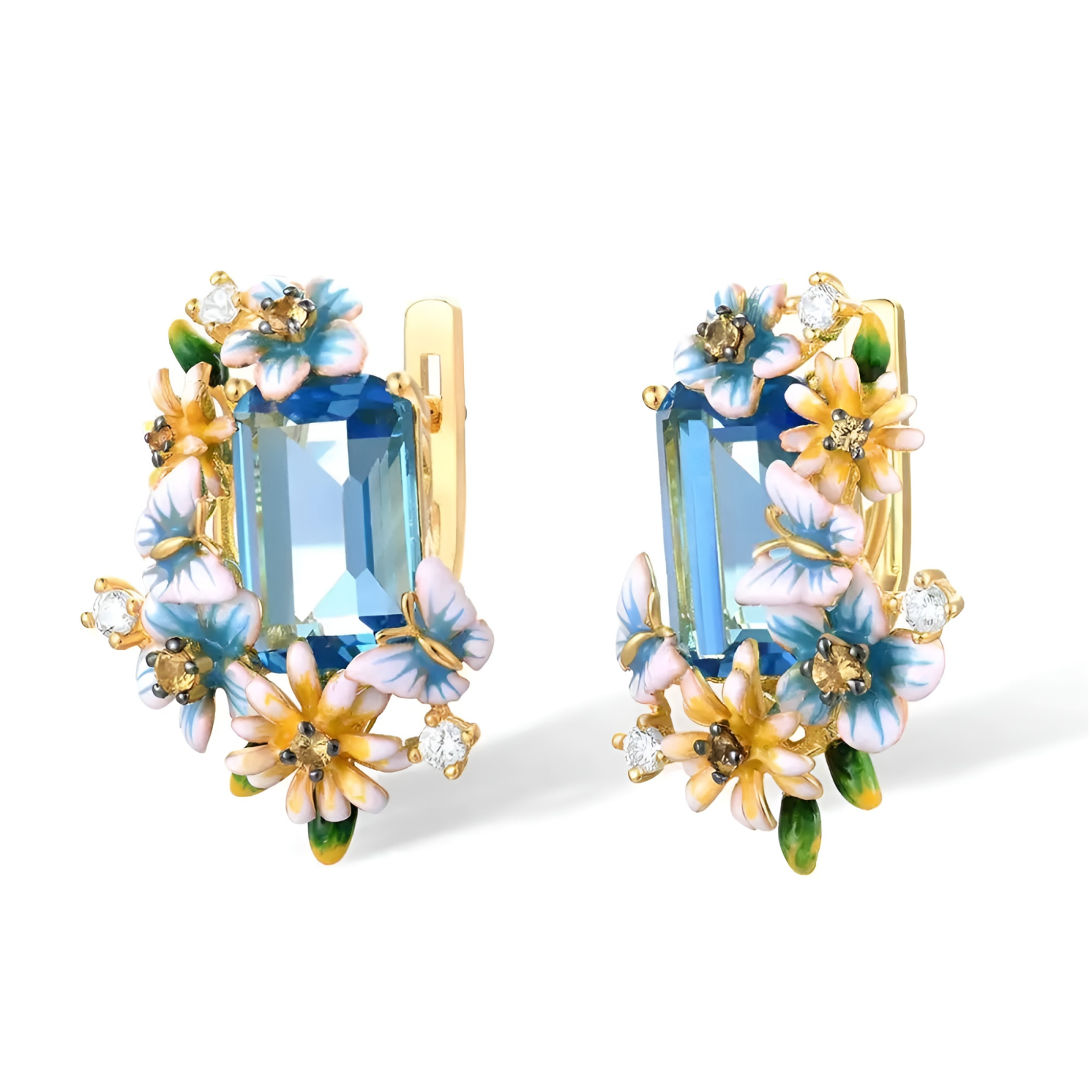 Cercei aurii, realizați din cupru placat cu aur 18K și email pictat manual, decorați cu piatră de zirconiu albastră, fluturi și flori.
