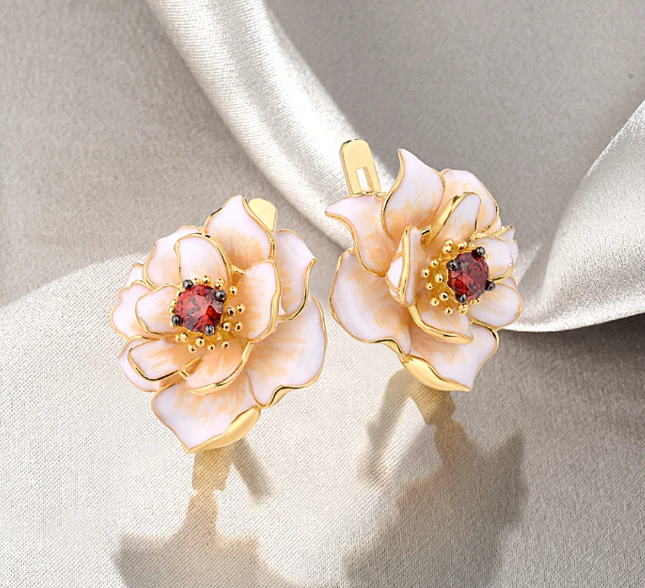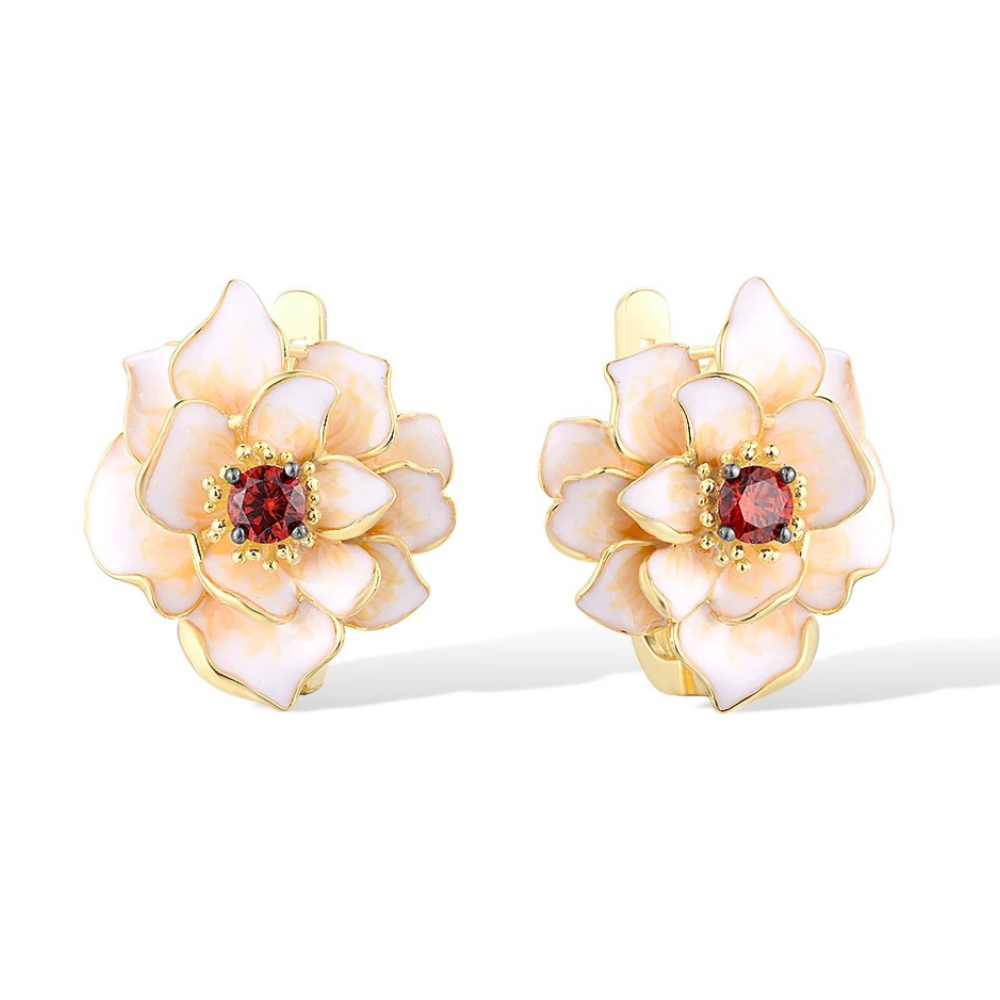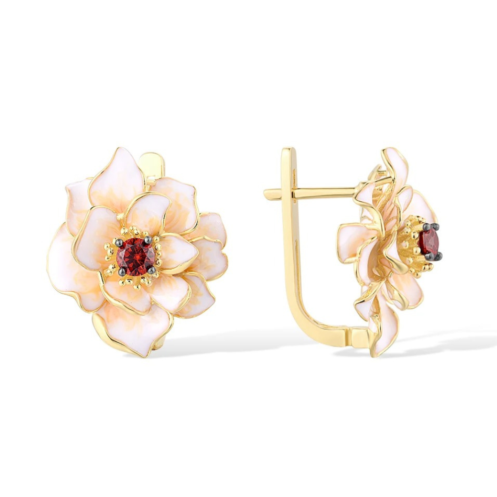 Cercei în formă de floare, realizați din cupru placat cu aur 18K și email pictat manual.