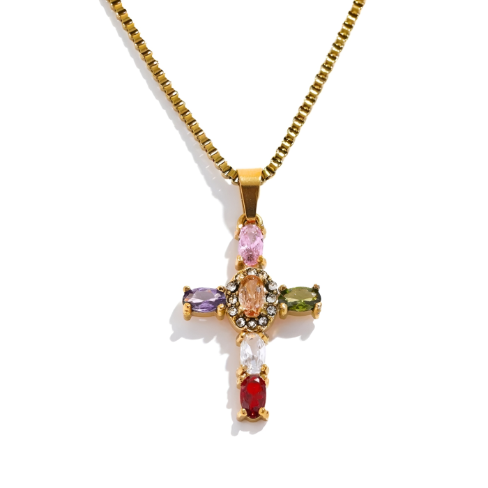 EVA GRACE Colier Trinity, auriu, cu pietre multicolore și pandantiv în formă de cruce, din oțel inoxidabil placat cu aur 18K