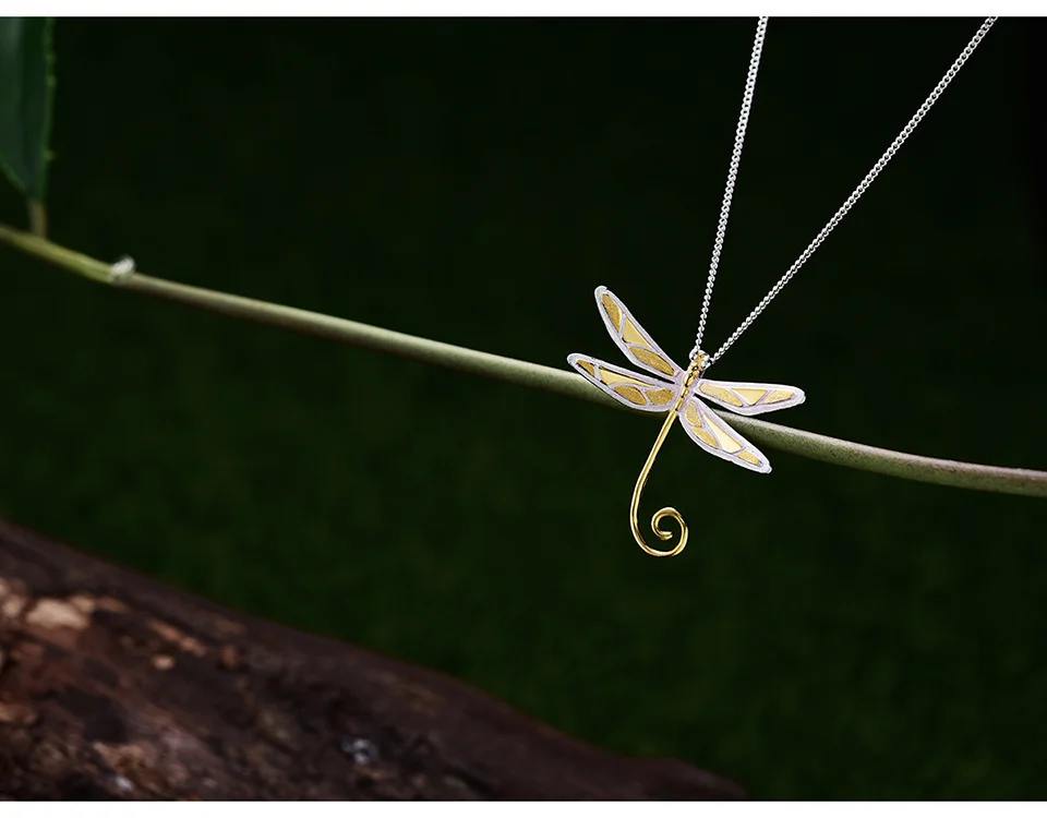 Colier cu pandantiv în formă de libelulă, realizat manual din argint 925 placat cu aur 18K.