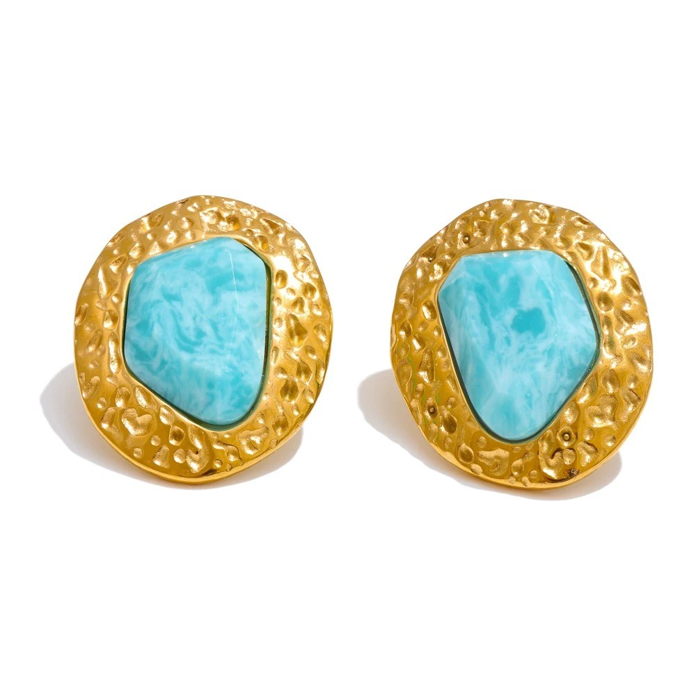 Round gold stud earrings, made of 18K gold-plated stainless steel and decorated with amazonite.