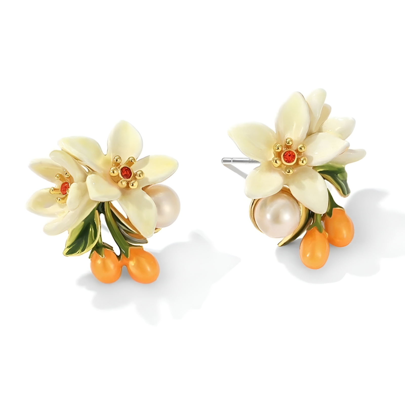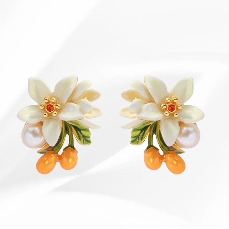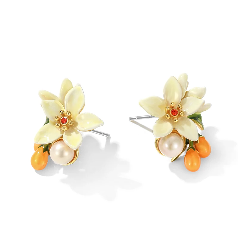 Cercei tip stud cu model floral și montură aurie, realizați din cupru placat cu aur 18K și email pictat manual.