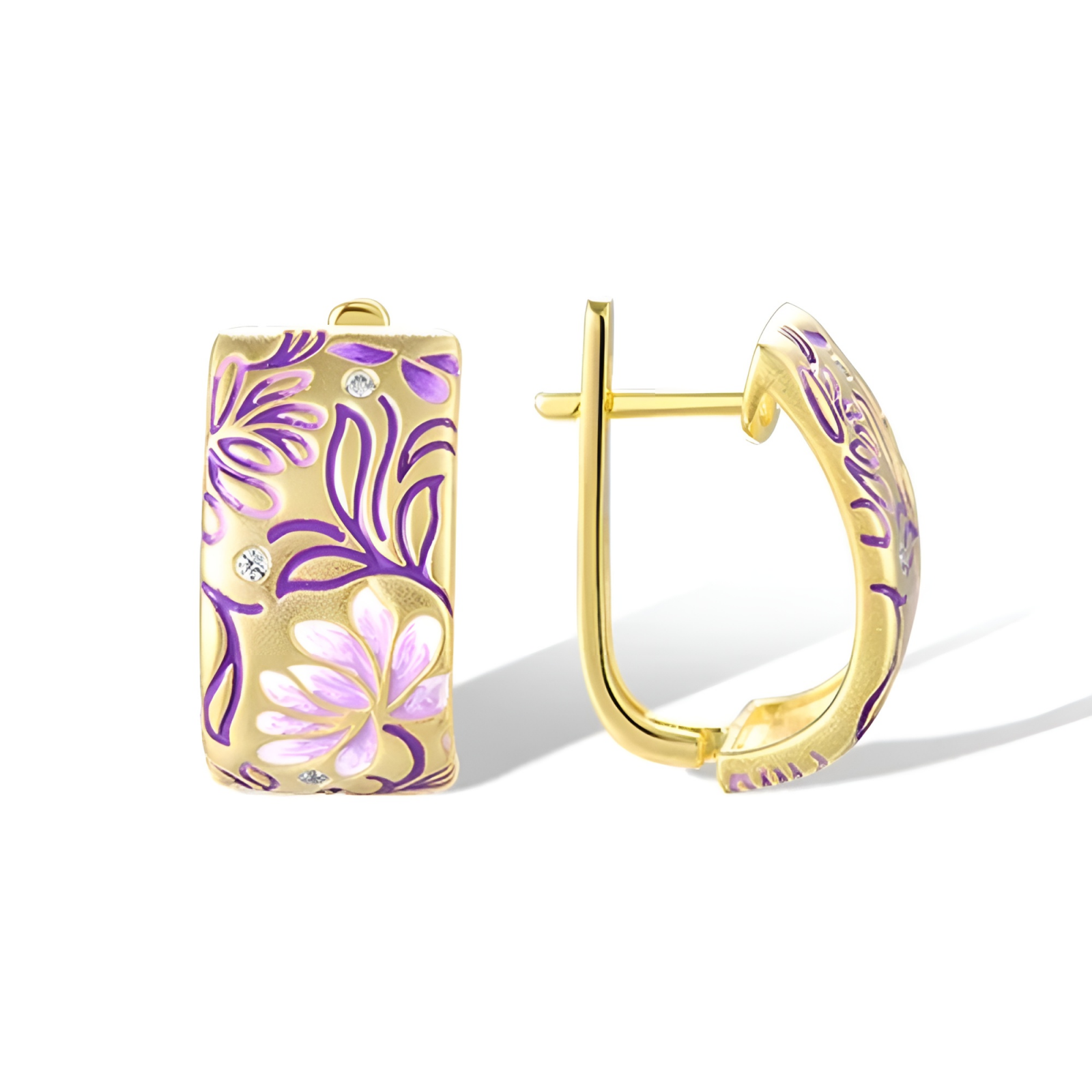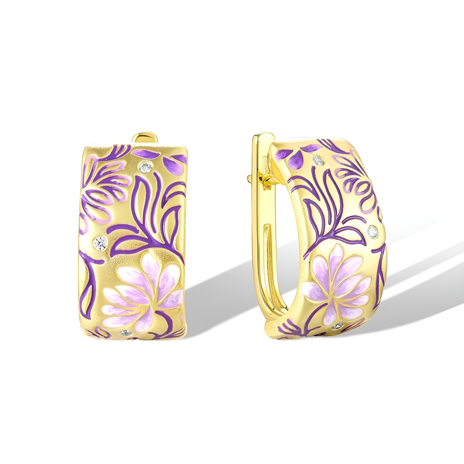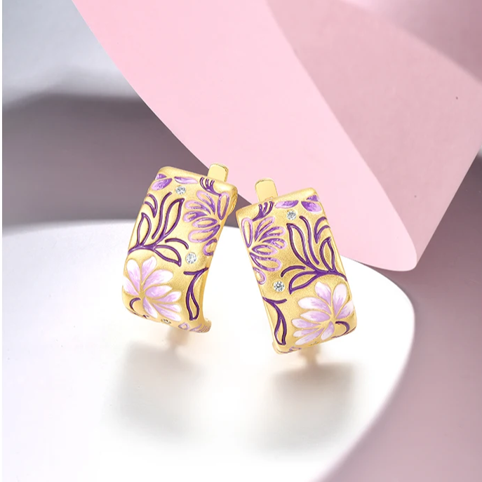 Cercei aurii, realizați din cupru placat cu aur de 18K și email pictat manual, cu model floral.