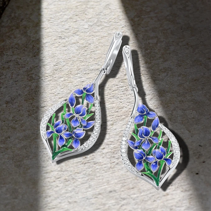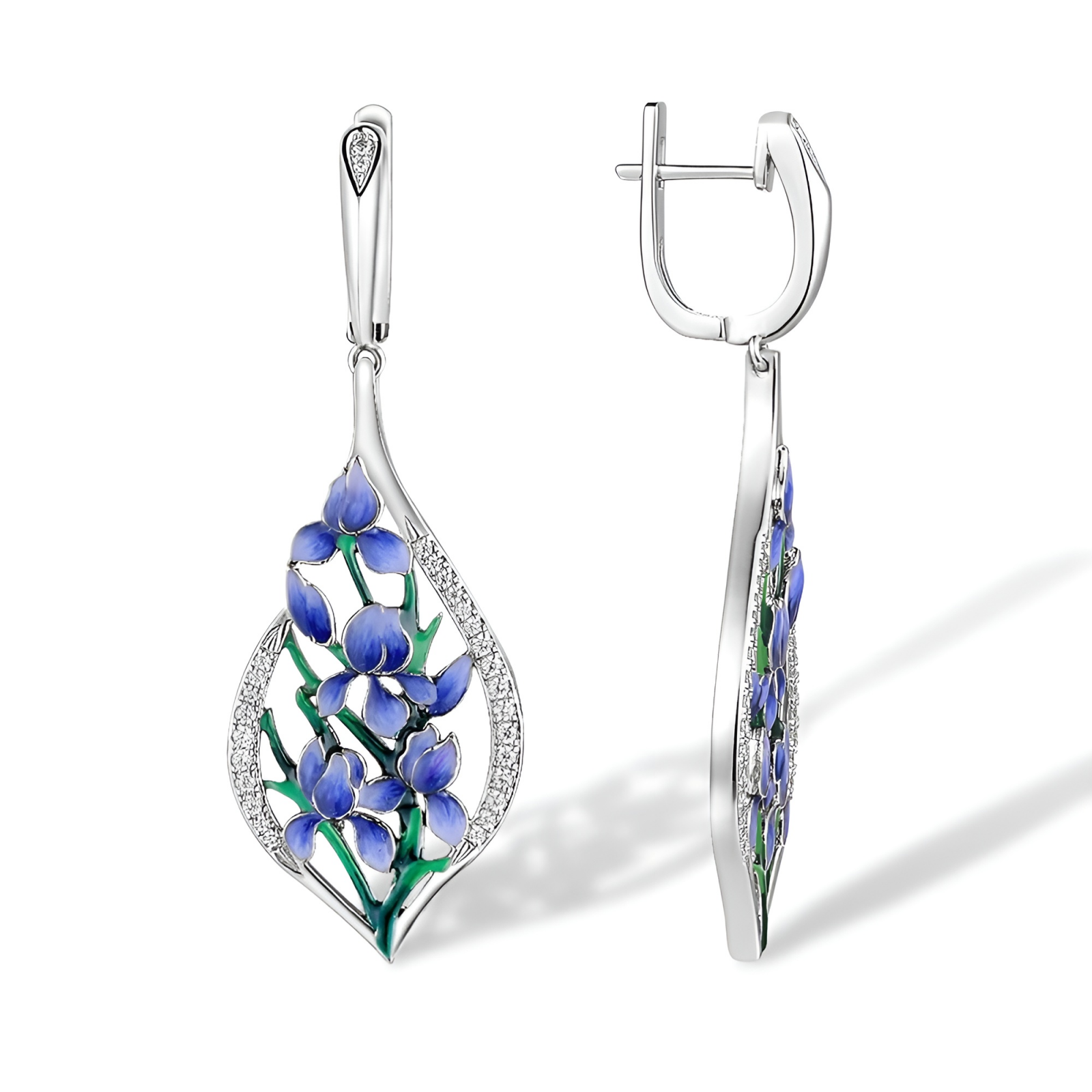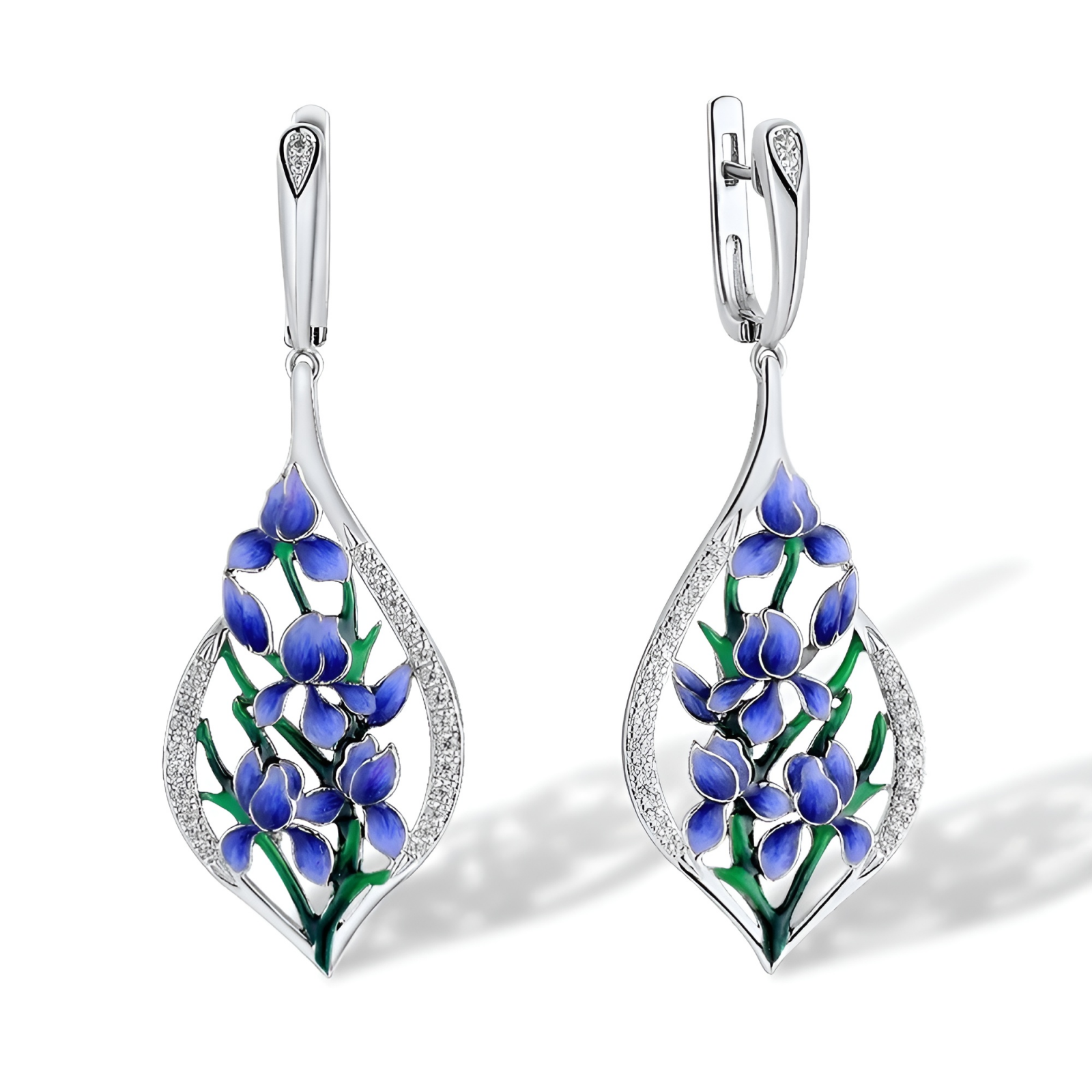 Cercei argintii în formă de lacrimă, realizați din cupru placat cu argint 925 și email pictat manual, cu model floral.