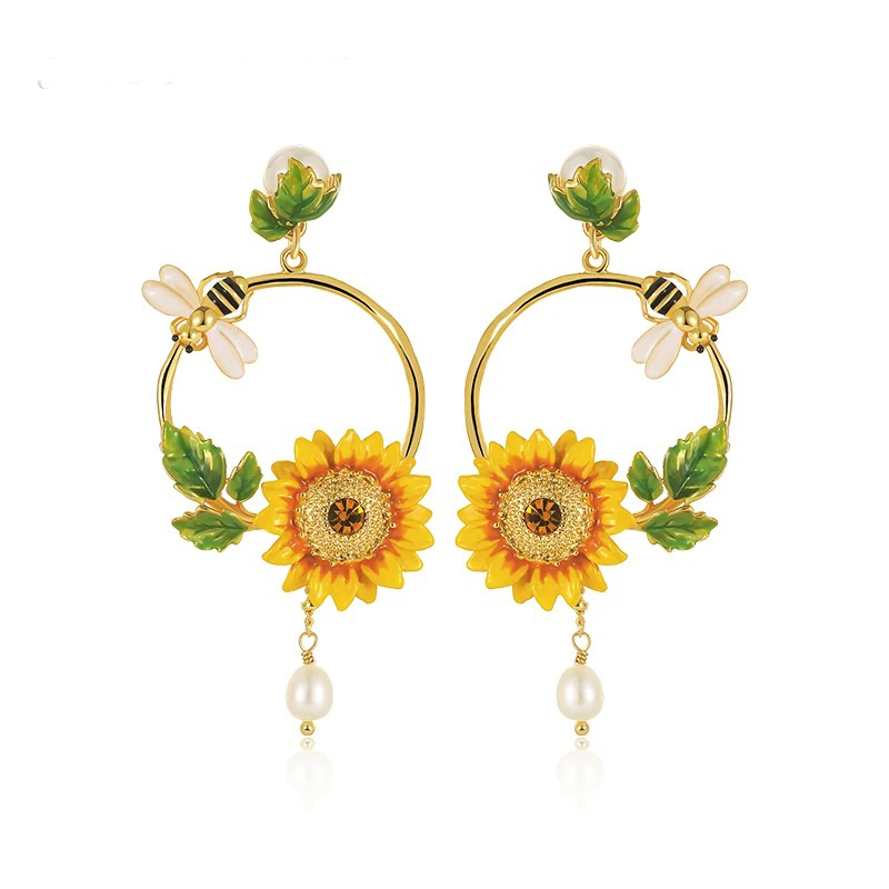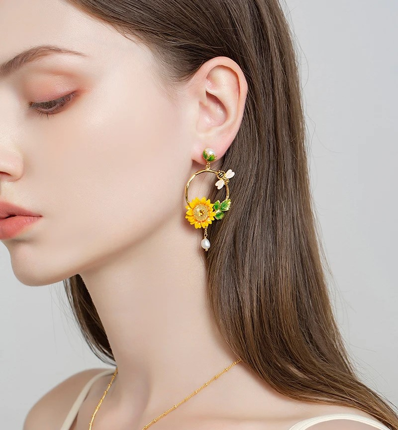 Cercei Sunflower, lungi, placați cu aur 18K, din email pictat manual - Colecția Fable