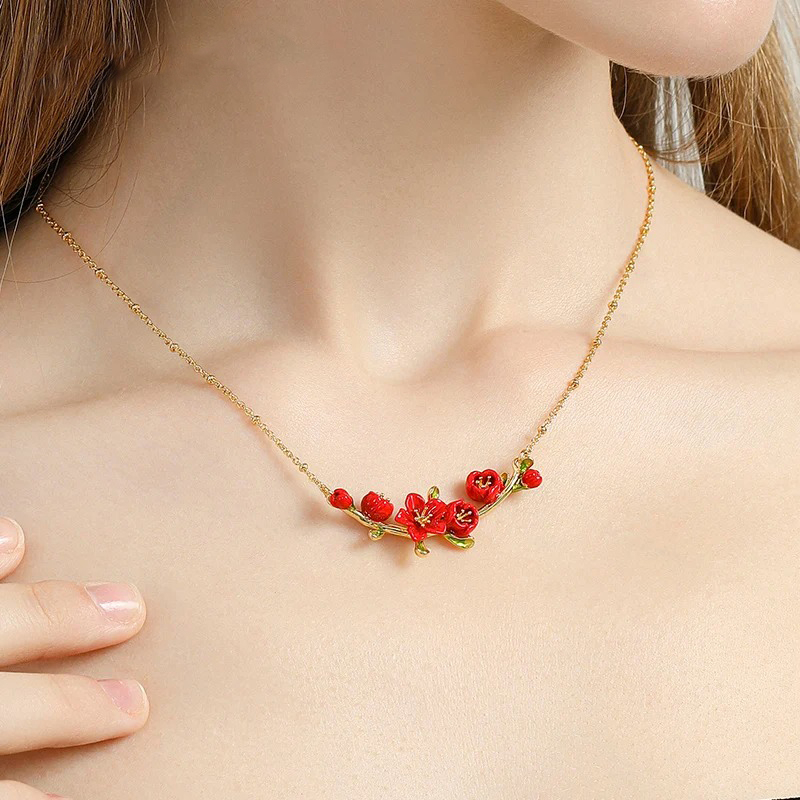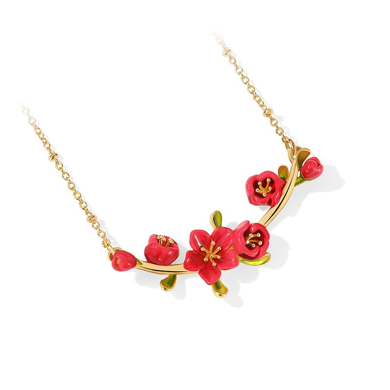 Colier realizat din cupru placat cu aur 18K și email pictat manual, cu design floral.