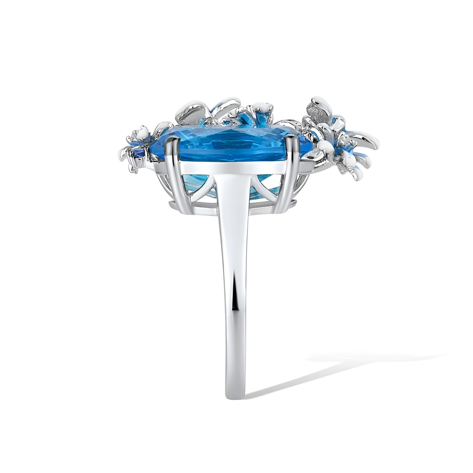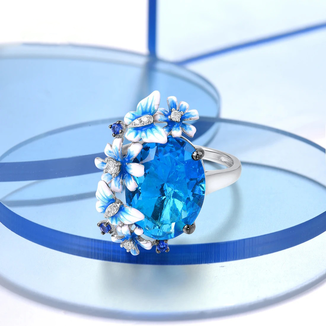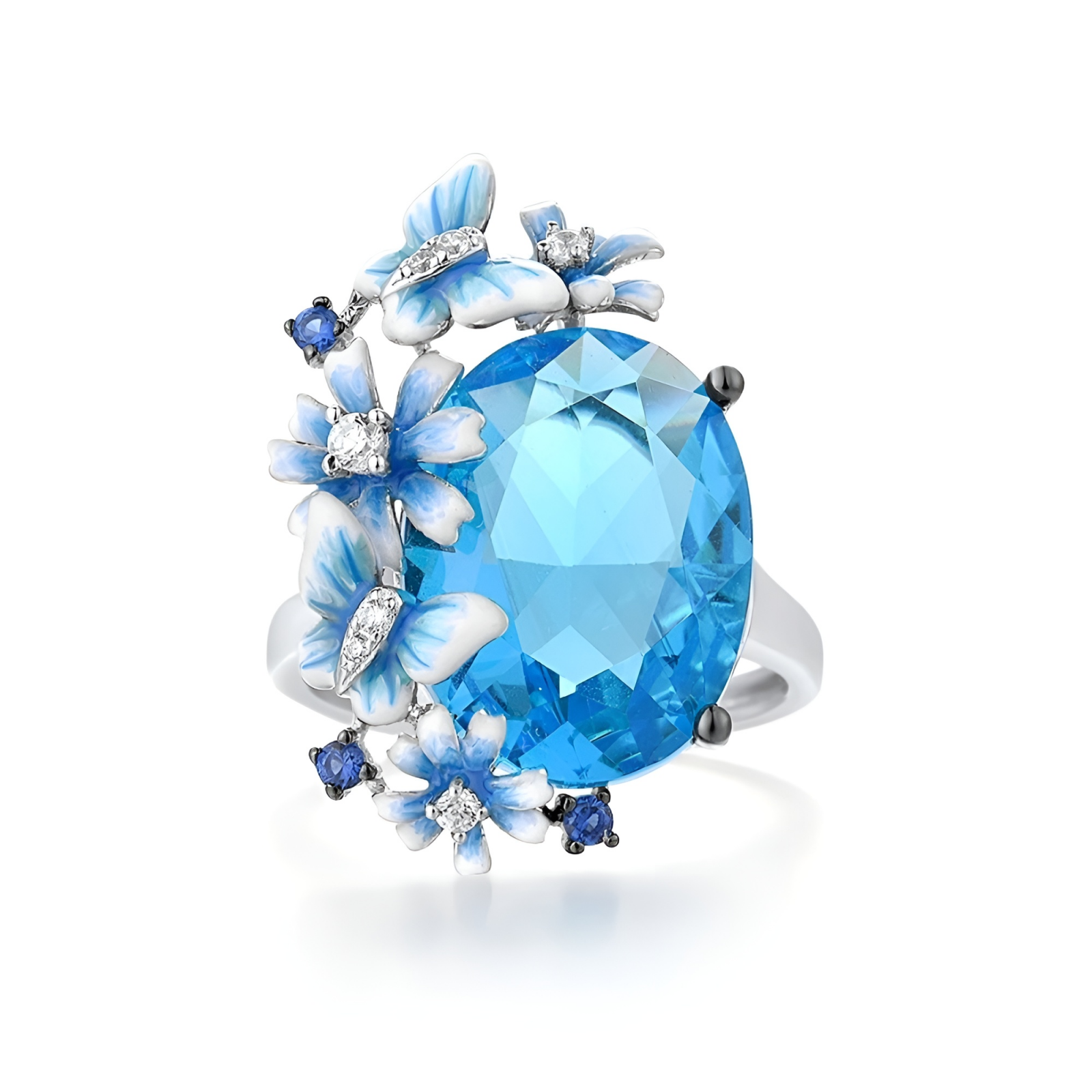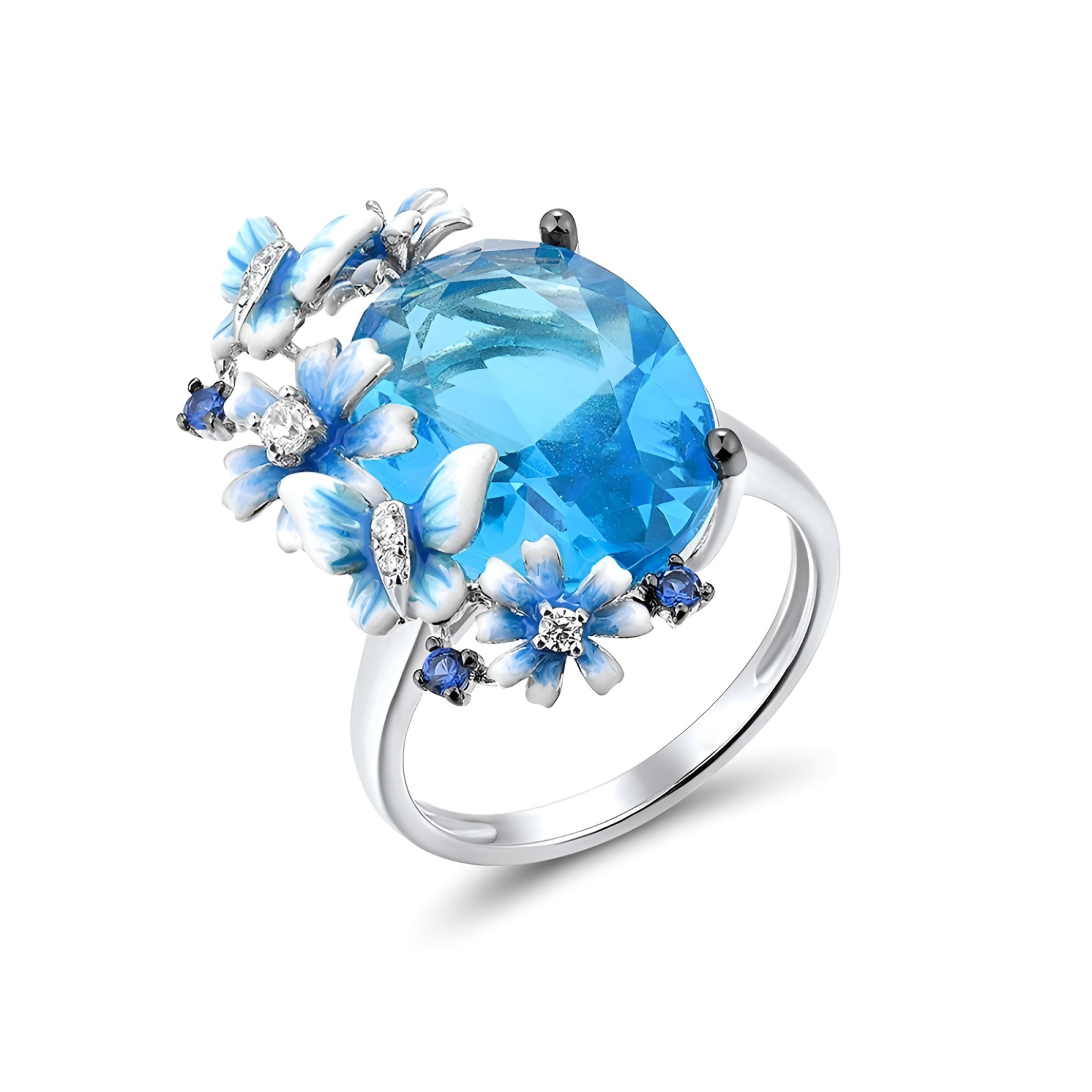 Inel argintiu, realizat din cupru placat cu argint 925 și email pictat manual, decorat cu piatră ovală albastră de zirconiu, fluturi și flori.