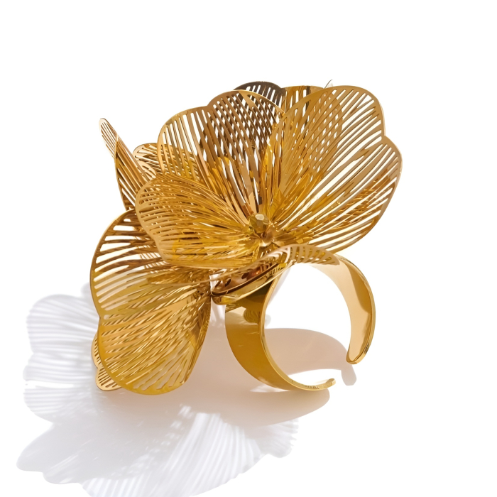 EVA GRACE Inel Eda, auriu, oversize, din oțel inoxidabil placat cu aur, cu model abstract floral, reglabil - Colecția Glamour
