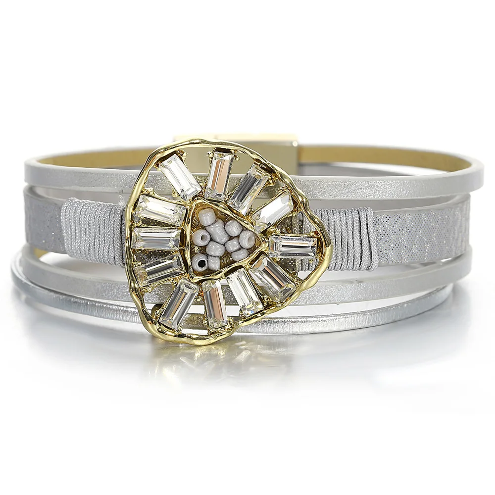 Brățară Luz, argintie, lată, confecționată din aliaj de zinc și piele imitație, decorată cu zirconiu, cu închidere magnetică.