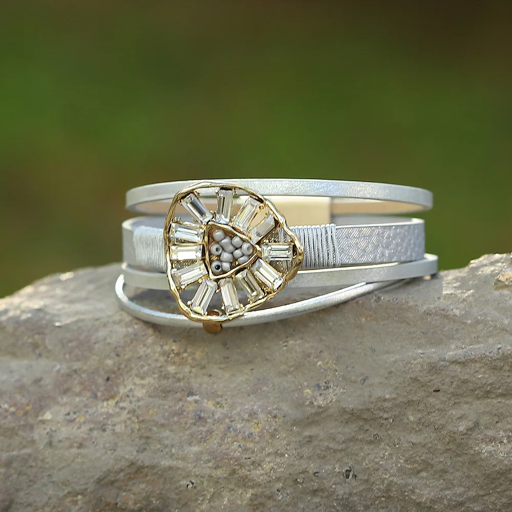 Brățară Luz, argintie, din piele, cu pietre și mărgele