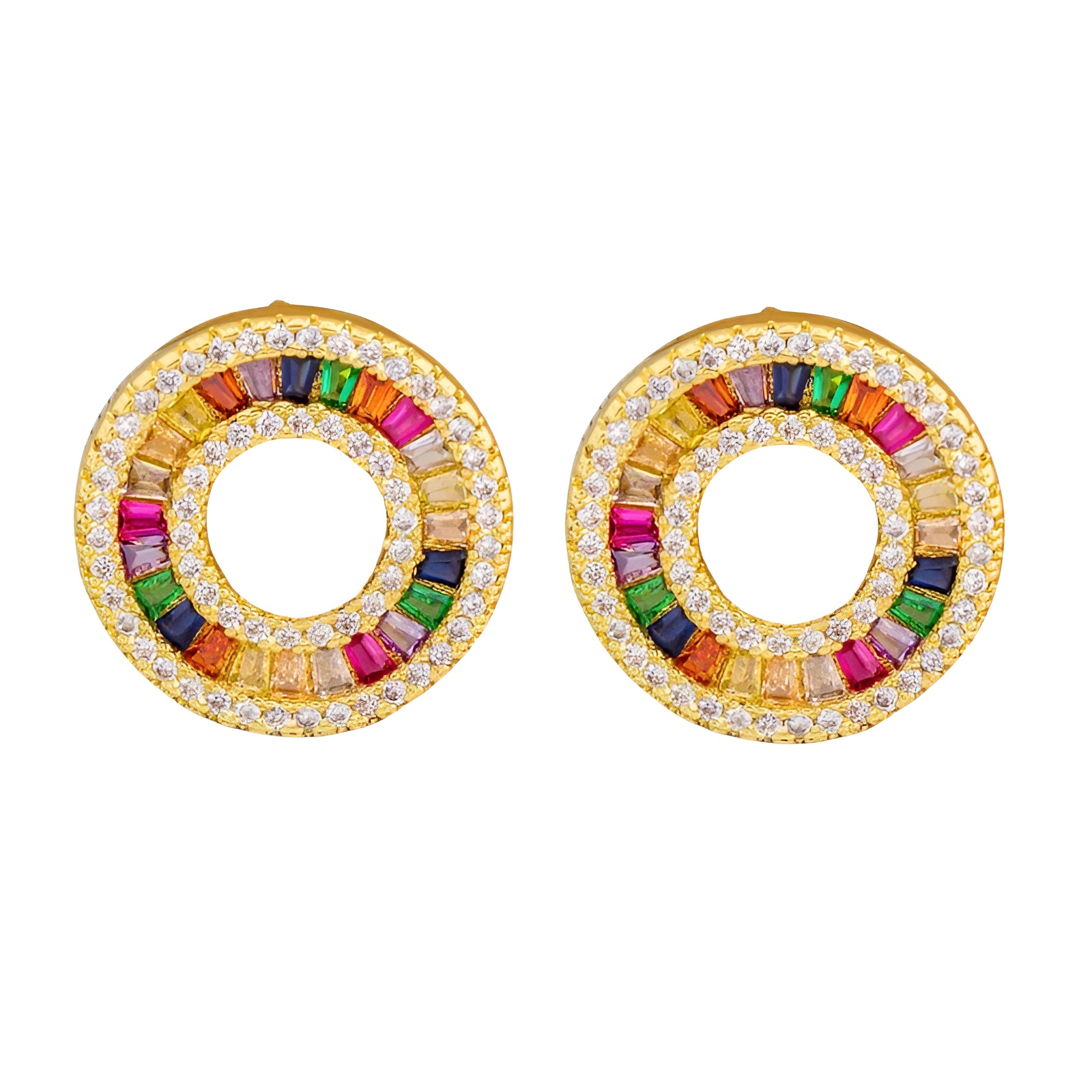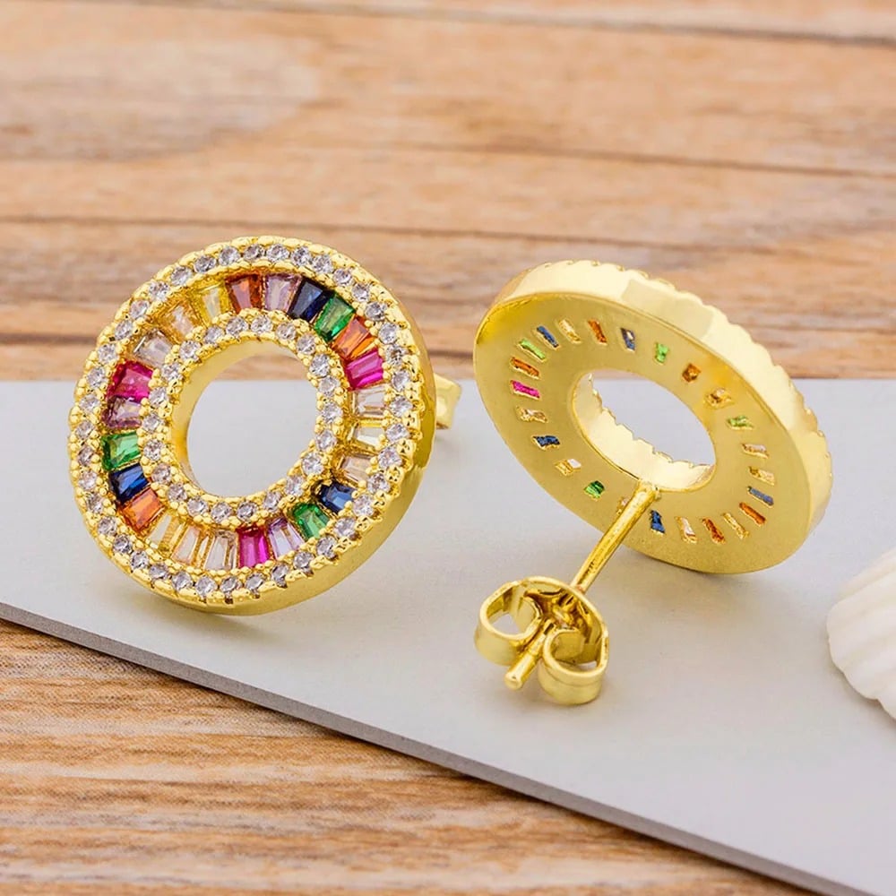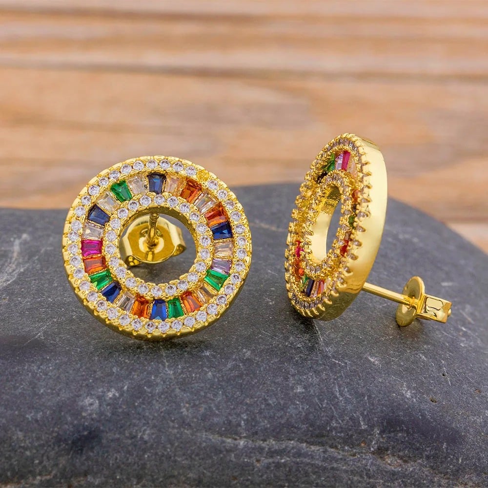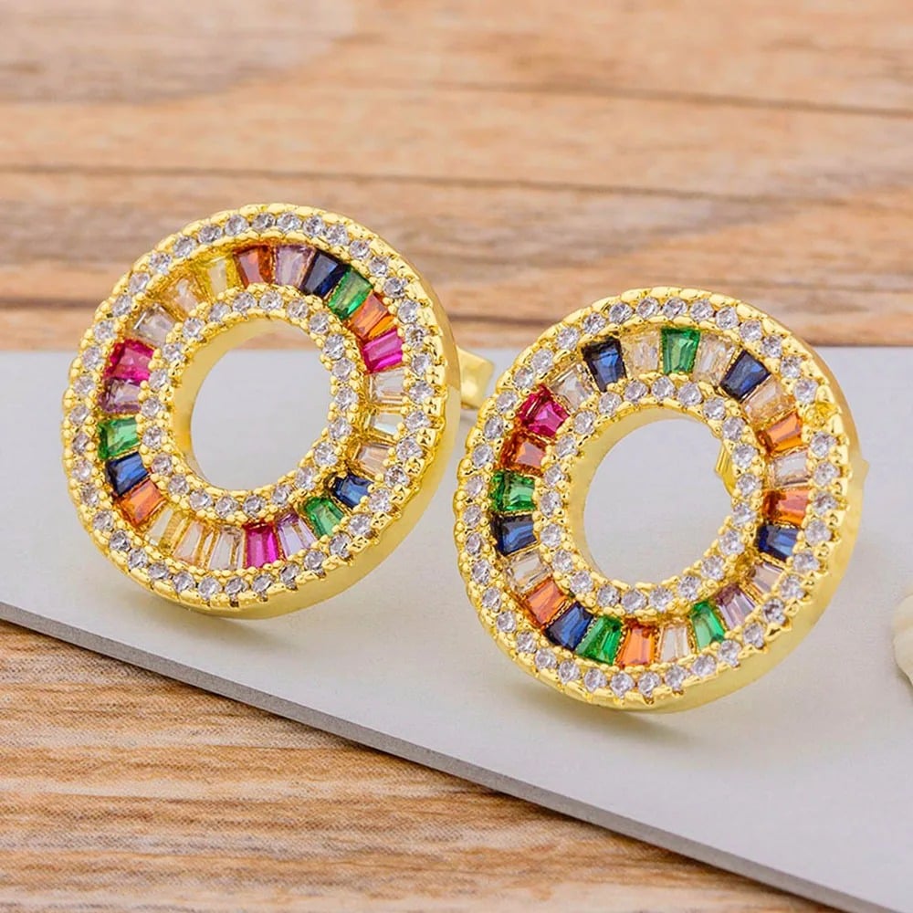 Cercei aurii rotunzi, realizați din cupru și decorați cu pietre multicolore de zirconiu.